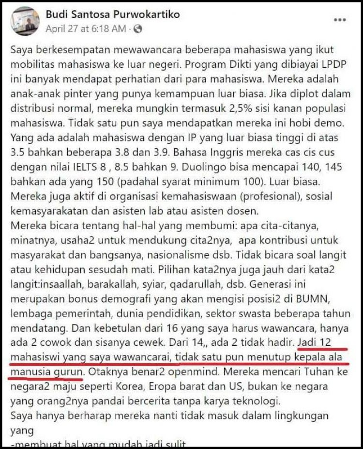 Penilaian itu muncul karena di dalam postingan itu terdapat kalimat "Jadi 12 mahasiswi yang saya wawancarai, tidak satupun yang menutup kepala ala manusia gurun".