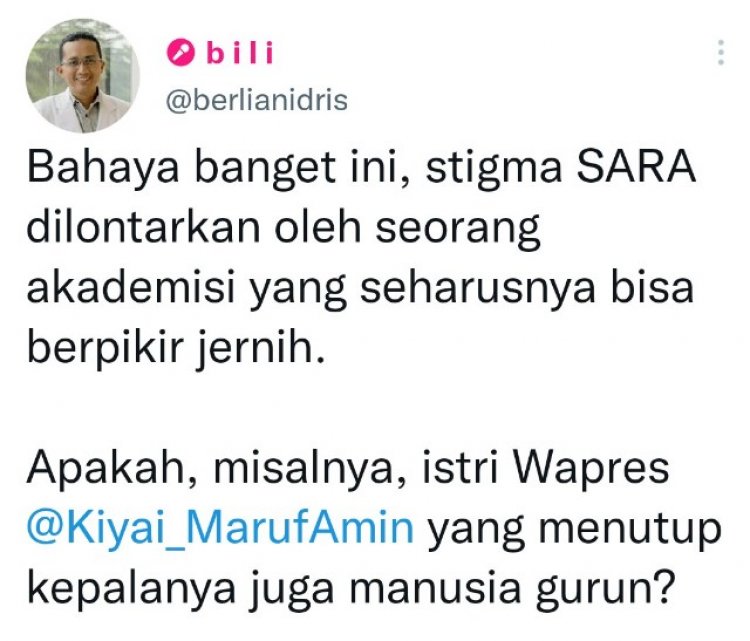 "Bahaya banget ini, stigma SARA dilontarkan oleh seorang akademisi yang seharusnya bisa berpikir jernih. Apakah, misalnya, istri Wapres @Kiyai_MarufAmin yang menutup kepalanya juga manusia gurun?" kritik dokter kardiolog yang juga kader Partai Demokrat, Berlian Idriansyah Idris, melalui @berlianidris.