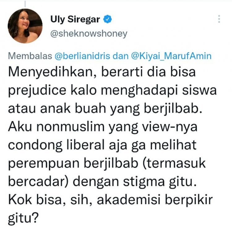 "Menyedihkan, berarti dia bisa prejudice kalo menghadapi siswa atau anak buah yang berjilbab. Aku non-muslim yang view-nya condong liberal aja ga melihat perempuan berjilbab (termasuk bercadar) dengan stigma gitu. Kok bisa, sih, akademisi berpikir begitu?" kata @sheknowshoney.