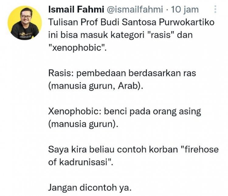 "Tulisan Prof. Budi Santosa Purwokartiko ini bisa masuk kategori "rasis" dan "xenophobic". Rasis: perbedaan berdasarkan ras (manusia gurun, Arab). Xenophobic: benci pada orang asing (manusia gurun). Saya kira beliau contoh korban "firehose of kadrunisasi. Jangan ditiru ya," kata CEO Drone Emprit Ismail Fahmi melalui @ismailfahmi, seperti dikutip Sabtu (30/4/2022).