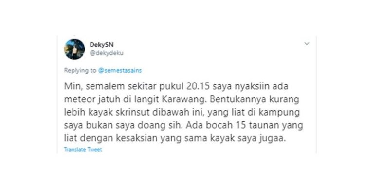 Twit yang sama juga diunggah pengguna Twitter lainnya, yang mengaku melihat meteor jatuh di wilayah Karawang.