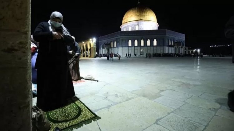 Di pelataran Masjid Al-Aqsa di kota tua Yerusalem, Israel, umat Islam menggelar tarawih pertama, 12 April 2021, sekaligus penanda sebagai awal puasa Ramadan. (Getty Images)