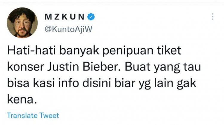 "Hati-hati banyak penipuan tiket konser Justin Bieber," kata Kunto Aji ditilik dari akun Twitter @KuntoAjiW pada Selasa (29/3/2022).