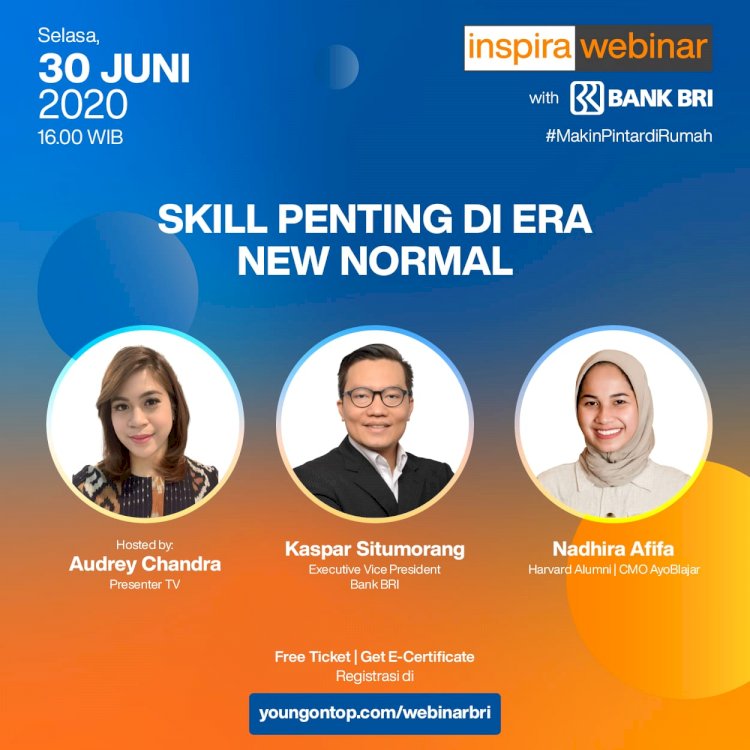 Skill apa aja yang harus kita kuasai di era new normal? Yuk temukan jawabannya di Inspira Webinar #MakinPintardiRumah with Bank BRI: ‘Skill Penting di Era New Normal’ bareng Bapak Kaspar Situmorang, Executive Vice President Bank BRI dan Kak Nadhira Afifa, Harvard Alumni & CMO AyoBlajar hari Selasa, 30 Juni 2020, pukul 16.00 WIB. Ini dia detail acaranya: