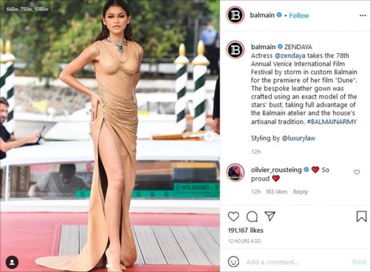 Zendaya tampil menarik dalam pemutaran film "Dune" di Venice Film Festival, Jumat (3/9/2021) waktu setempat. Aktris cantik ini mengenakan dress unik koleksi brand Balmain. Dress itu memiliki belahan tinggi dengan aksen "basah" yang membuat penampilan Zendaya terlihat seperti patung dari museum kuno. Balmain membuat dress itu secara khusus untuk Zendaya.