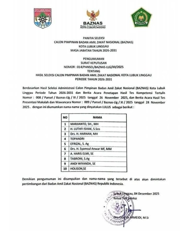 Di akhir sambutannya, Sekda berharap hasil dari rangkaian seleksi ini dapat melahirkan pimpinan BAZNAS Kota Lubuk Linggau periode 2026–2031 yang berintegritas, amanah, serta mampu menjalankan tugas dan tanggung jawab secara optimal.