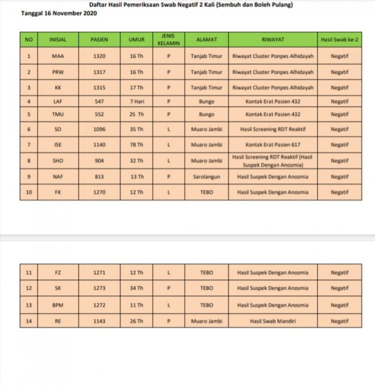 14 orang yang dinyatakan sembuh hari ini, lanjut Johansyah, berasal dari Kabupaten Tanjab Timur, Bungo, Muarojambi, Sarolangun dan Tebo.