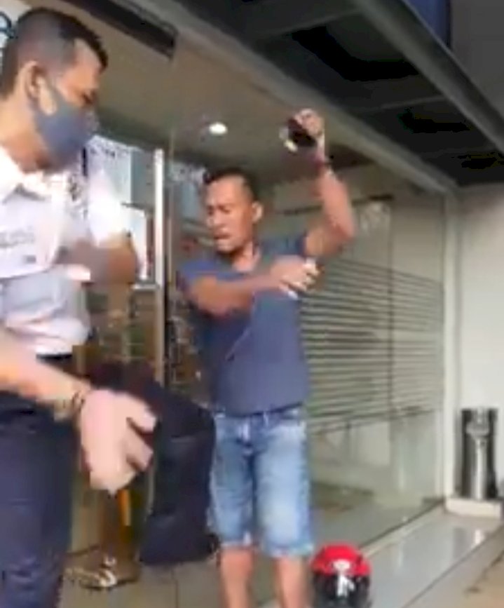 Seorang pria yang hendak masuk ke gerai Anjungan Tunai Mandiri (ATM) sebuah bank justru terlibat perselisihan dengan petugas keamanan.