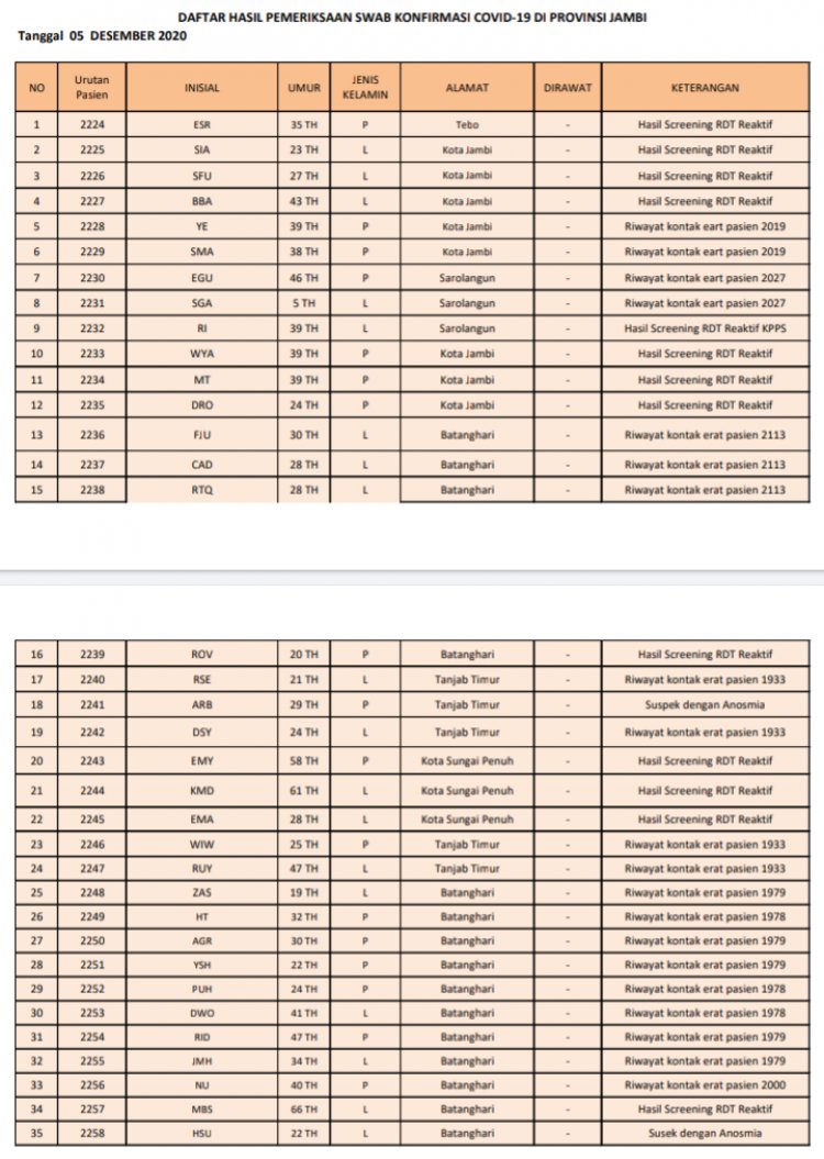 BRITO.ID, BERITA JAMBI - Update Covid-19 Provinsi Jambi Sabtu tanggal 5 Desember 2020 pecah rekor lagi. Kali ini semakin tinggi yakni 113 orang terkonfirmasi positif Covid-19.