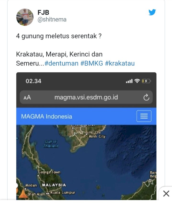 Sejumlah unggahan di media sosial Twitter menyebutkan empat gunung api di Indonesia mengalami erupsi secara serentak. Unggahan ini viral di media sosial Twitter. Keempat gunung api tersebut adalah Gunung Krakatau, Gunung Merapi, Gunung Kerinci, dan Gunung Semeru.