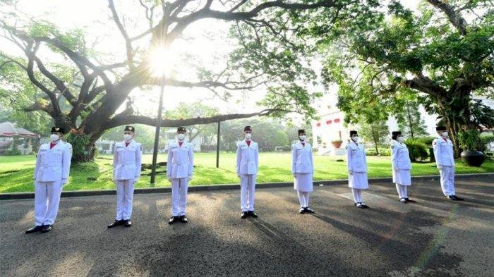 8 anggota Paskibraka Nasional 2020, 3 diantaranya telah ditugaskan untuk mengibarkan Sang Merah Putih di halaman Istana Merdeka pada Peringatan Detik-Detik Proklamasi Kemerdekaan Republik Indonesia pada Senin (17/8/2020). (Biro Pers Sekretariat Presiden/Muchlis Jr)