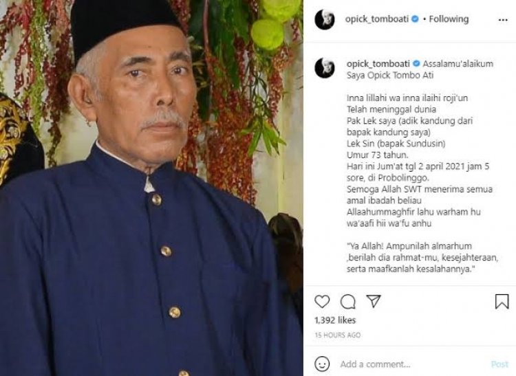 "Assalamu'alaikum. Saya Opick Tombo Ati Inna lillahi wa inna ilaihi roji'un. Telah meninggal dunia. Pak Lek saya (adik kandung dari bapak kandung saya) Lek Sin (bapak Sundusin) Umur 73 tahun. Hari ini Jum'at tgl 2 april 2021 jam 5 sore, di Probolinggo," tulis Opick dikutip Dream, Sabtu 3 April 2021.