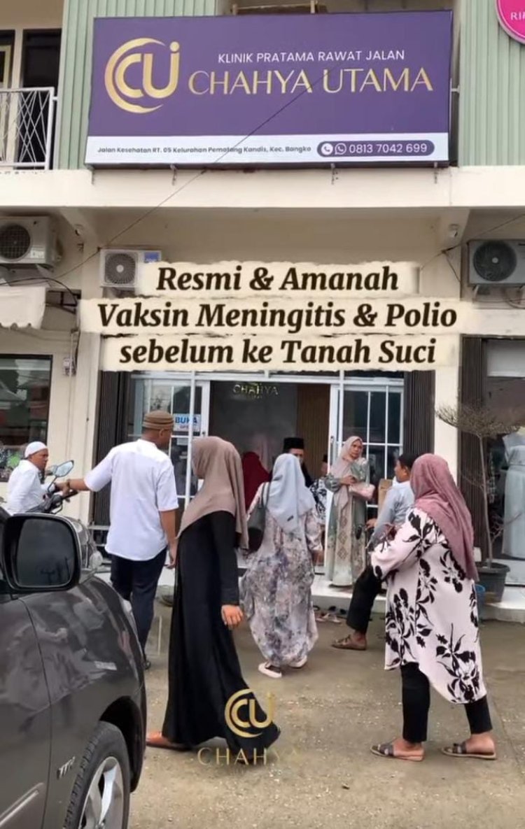 BRITO.ID I BERITA MERANGIN - Klinik Pratama Rawat Jalan Chahya Utama, yang berlokasi di Jalan Kesehatan RT 05, Kelurahan Pematang Kandis, Kecamatan Bangko, kembali menjadi rujukan masyarakat untuk pelayanan vaksin meningitis dan polio bagi calon jemaah umrah maupun haji.