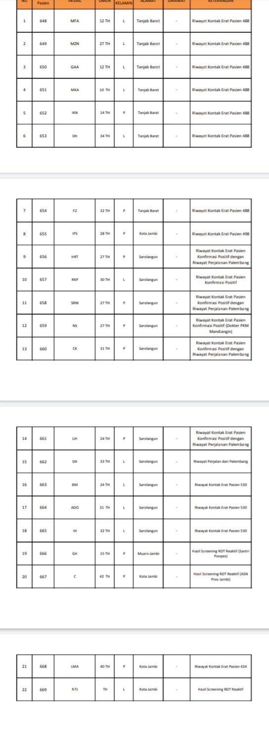Jubir Satgas Penanganan Covid-19 Provinsi Jambi, Johansyah, yang dikonfirmasi membenarkan hal tersebut, dan Ia mengatakan kalau dari 22 pasien ini, 1 diantaranya ASN Setda Pemprov Jambi.