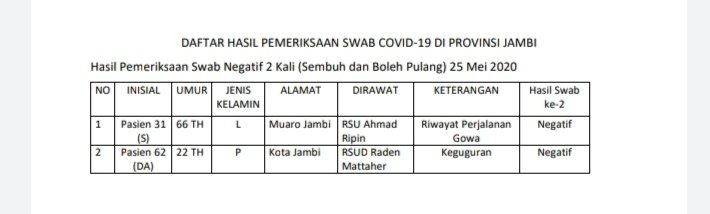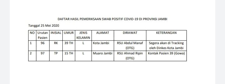 Pasien Positif dan Sembuh dari Corona Hari Ini, Johansyah: Dari Kota Jambi dan Muarojambi