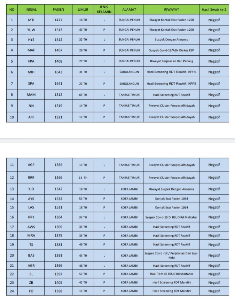 Berikut data pasien sembuh dari Covid-19 di Jambi: