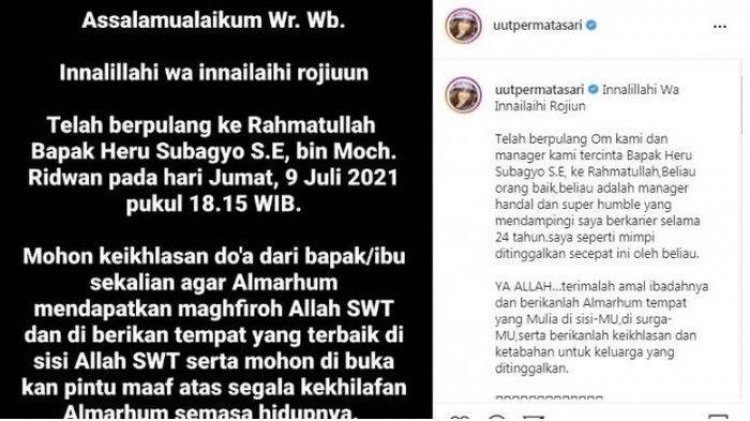 "Innalillahi Wa Innailaihi Rojiun. Telah berpulang Om kami dan manager kami tercinta Bapak Heru Subagyo S.E, ke Rahmatullah," tulis Uut Permatasari.