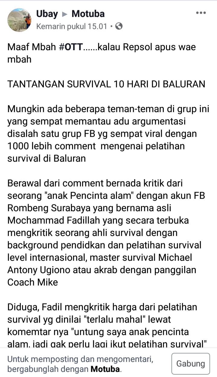 Mungkin ada beberapa teman-teman di grup ini yang sempat memantau adu argumentasi disalah satu grup FB yg sempat viral dengan 1000 lebih komentar mengenai pelatihan survival di Baluran. Seperti postingan yang dibagikan oleh Ubay di grup Motuba pada pukul 15.00 WIB, Minggu (9/2).