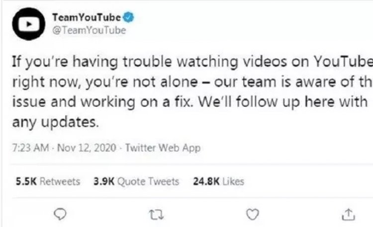 Pihak YouTube memberikan penjelasan mengenai gangguan menonton video di YouTube, dan tengah bekerja memperbaikinya, Kamis (12/11/2020). (Twitter/@TeamYouTube)